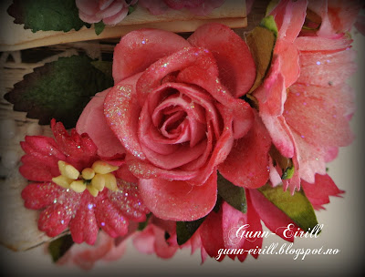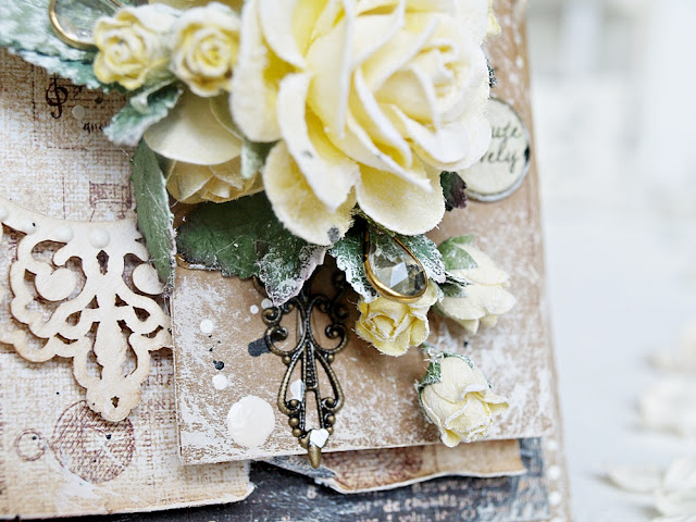 I used pastel lilies, added sweetheart flowers, leaves and different pearls. I also used die cuts: birds, swirls and lantern.