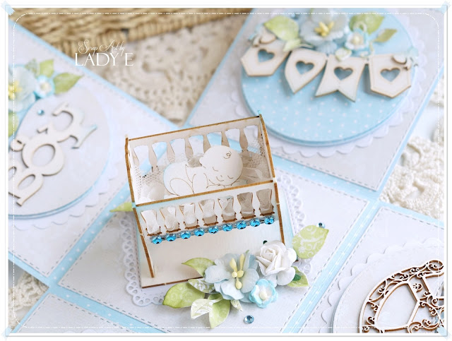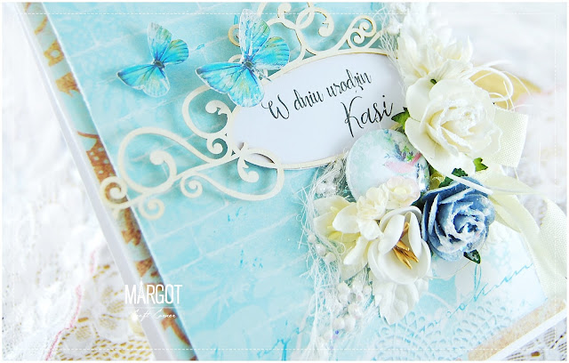 I used gorgeous, rich coloured magnolias, added white cottage roses and two kind of leaves. I also used some purple sweetheart blossoms and lots of self adhesive rhinestones. To make my flower cluster looks more natural I used some sissal fibre.