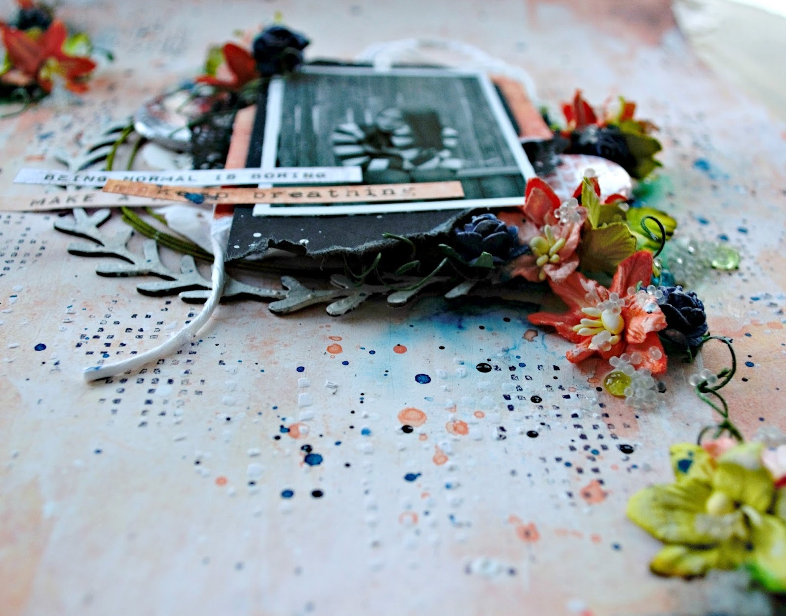 I wanted to create an effect of fallen again with flowers and I also used some ink to give the illusion that colors of the latter run away from delicately.