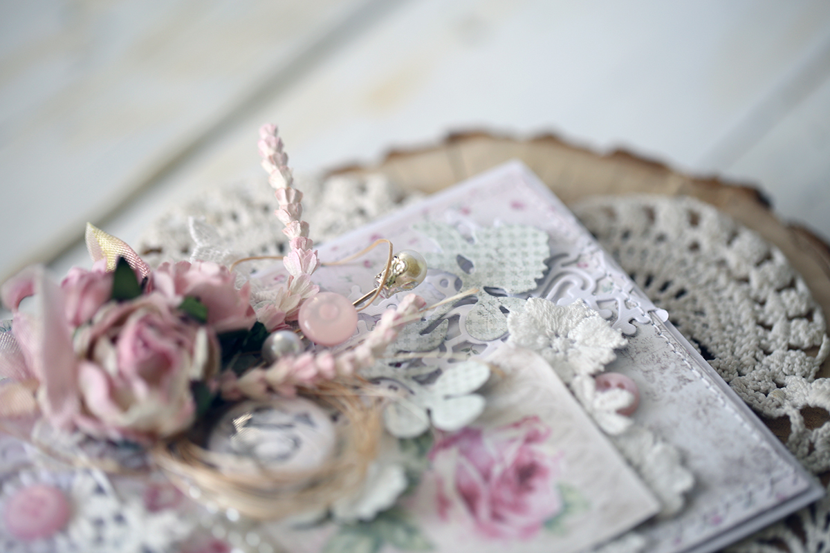 Evgenia Petzer with you today. I would love to show you my card that is romantic, tender and is just perfect for the wedding occasion. I have used the Maja Design papers here, some lovely cotton lace and gorgeous flowers in pink shades are of course by Wild Orchid Crafts.