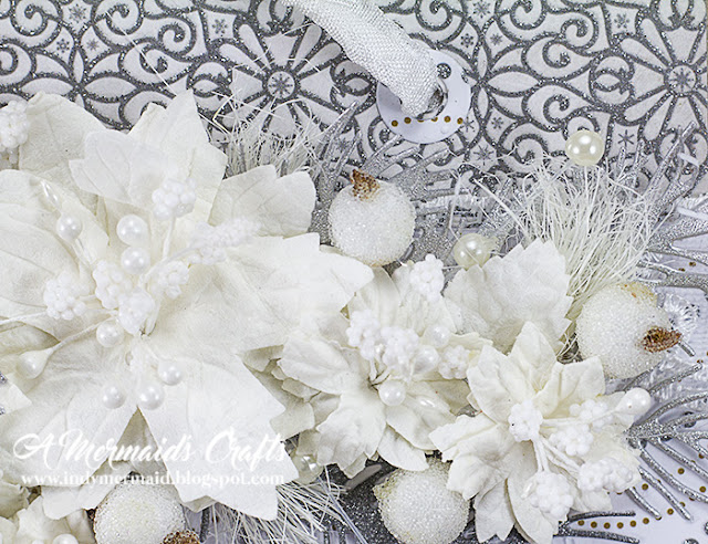 I wanted to make a banner I could hang on my fireplace mantle for Christmas. I used Pretty Flori Snow White flowers, and Mulberry Poinsettia Blooms in two sizes. In the center of the blooms, I used White Stamens, Double Head Pearl Stamens and Small Double Head Pearl Stamens. I also used Pearl Sprays, Frosted Berry Sprays, Mulberry Paper Leaves, Crown Pins, Frost Berry Sprays, Guipure Lace, Seam Binding and Sissal.