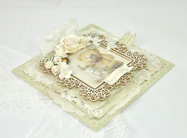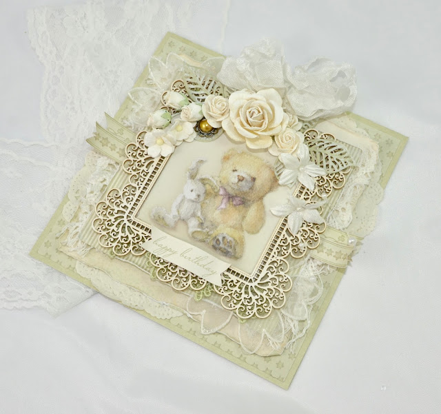 It's me, Cathrine here to show you my latest card that I made. It's a sweet baby birthday card. I really enjoyed making this one, and I have been using lot's of paper and fabric/laces layers to complete my card. I wanted my card to have a soft feeling, so I used flowers from Wild Orcid Crafts in only white tones. I hope you like it :-)