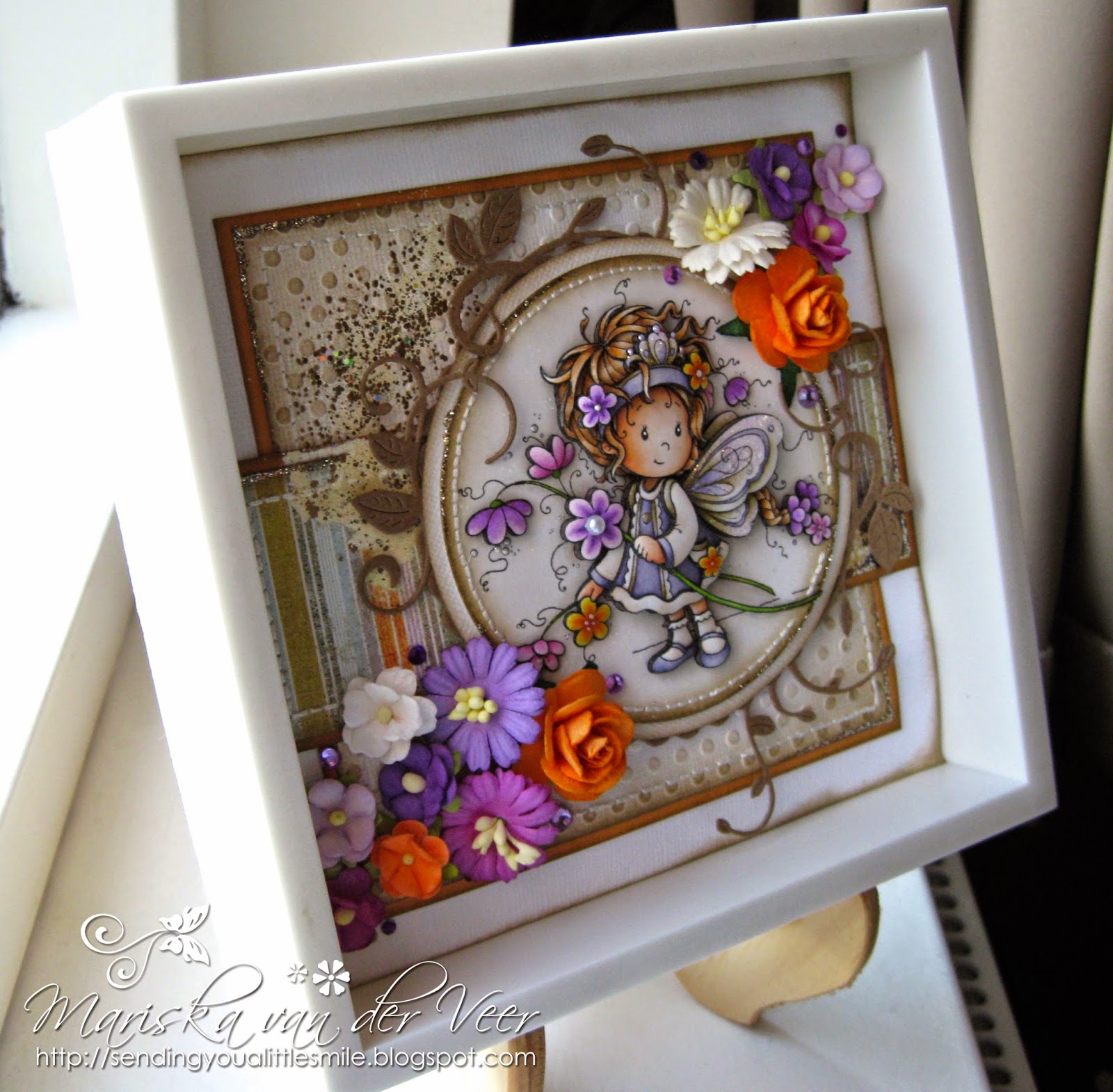 My name is Mariska van der Veer and I hope to be turning 40 this year. Together with my husband and best friend Marco I have three children, Dyanne (10), Amy (6) and Leon (4). We live in a small town in The Netherlands in the middle of a polder where greenhouses with gorgeous real flowers and goats are the view from our living room window. My hubby has a small company in the IT sector and I divide my time between the kids, the house and his company. For relaxation I love to run and craft. My craft projects take me hours and hours but I truly love the whole process of having an idea and making it come to life. Flowers are an essential part of my projects and I've been a big fan of Wild Orchid Crafts and their fabulous range of flowers for years so being part of the Wild Orchid Crafts team is heaven on earth for me!This is the complete project I'd like to share with you today. The image that I used is called Dyanne and she is actually a Wee Stamps character that Sylvia Zet, the artist behind Wee Stamps, based on the pictures and stories I shared with her about my daughter Dyanne. Dyanne is my dreamy girl who loves to read books and craft and who, when we walk together through the Polder, will fall behind because she "needs" to gather all these pretty little flowers she finds along the way. I made this shadowbox for her with "her" stamp and of course a spray of pretty flowers.